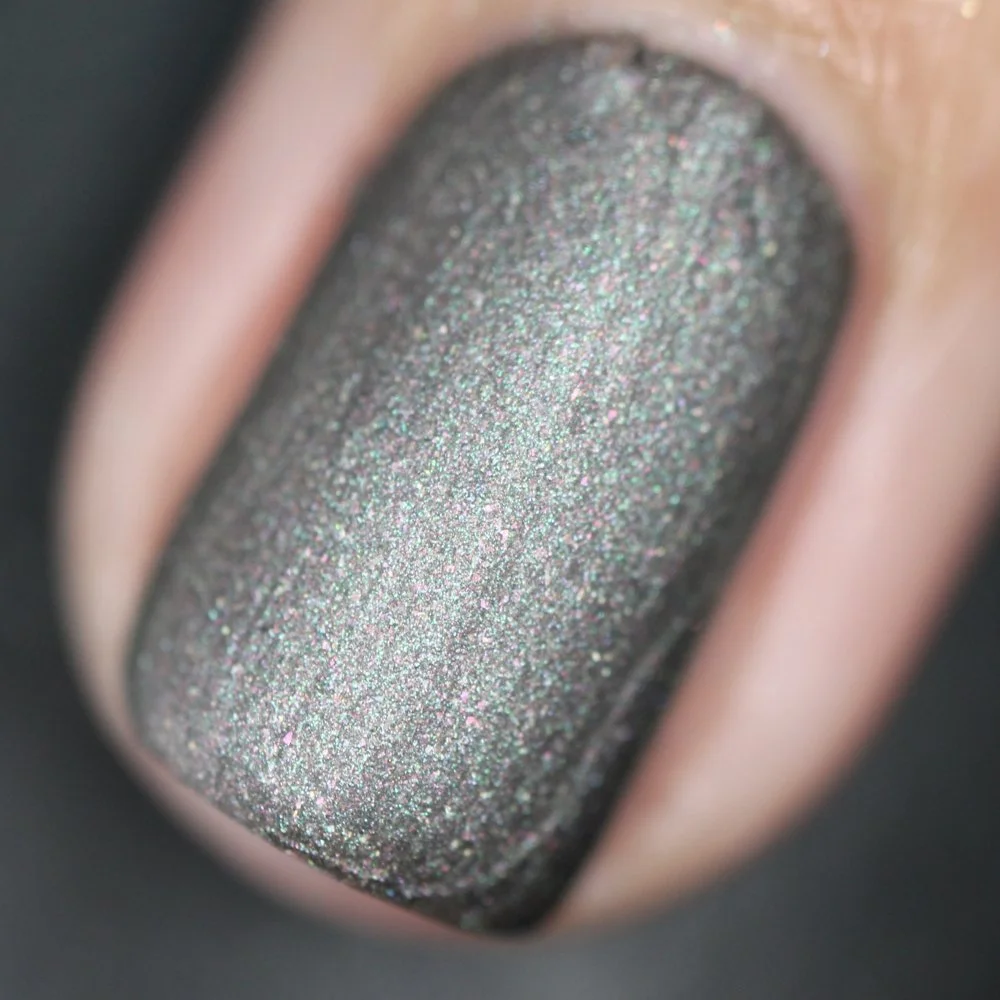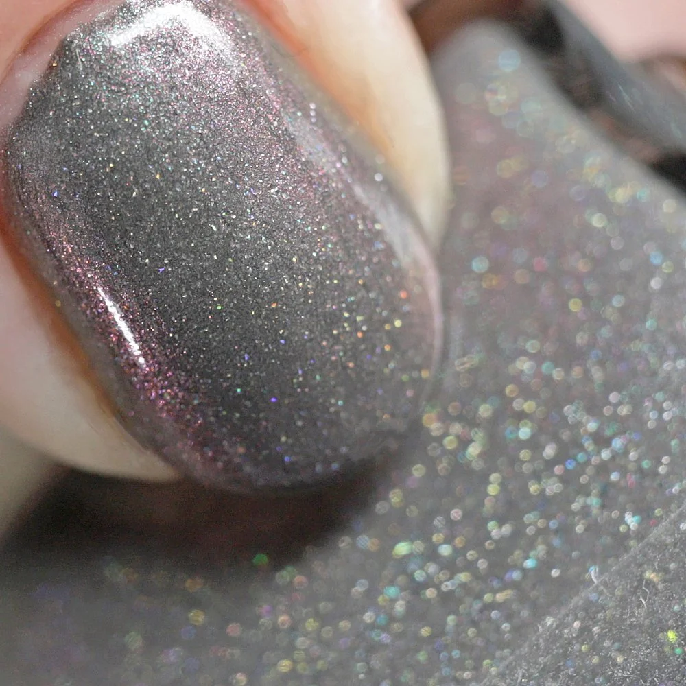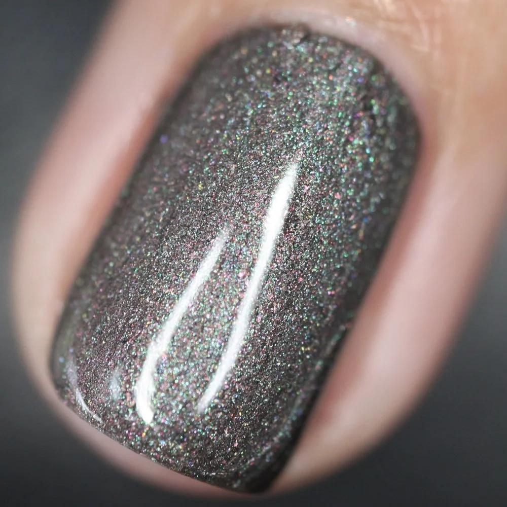 A dark gray-orange base filled with silver-to-green and red-to-orange color shifting shimmer, black holo microglitter, and holographic microflakies. Fully opaque in 2-3 coats depending on application.