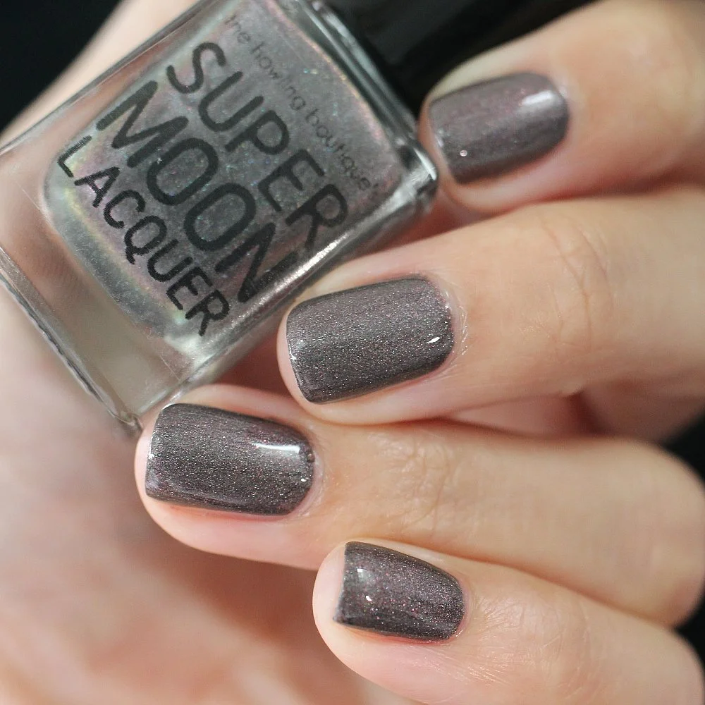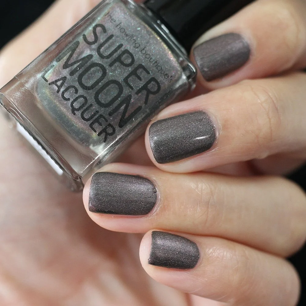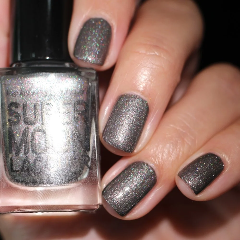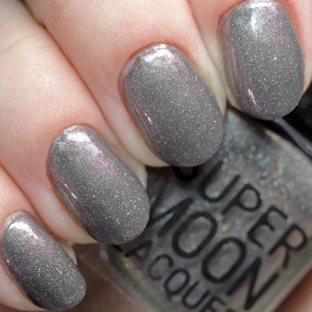A dark gray-orange base filled with silver-to-green and red-to-orange color shifting shimmer, black holo microglitter, and holographic microflakies. Fully opaque in 2-3 coats depending on application.