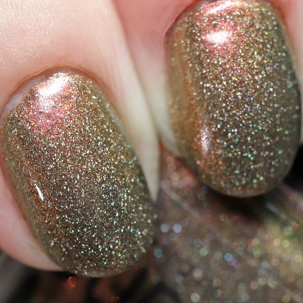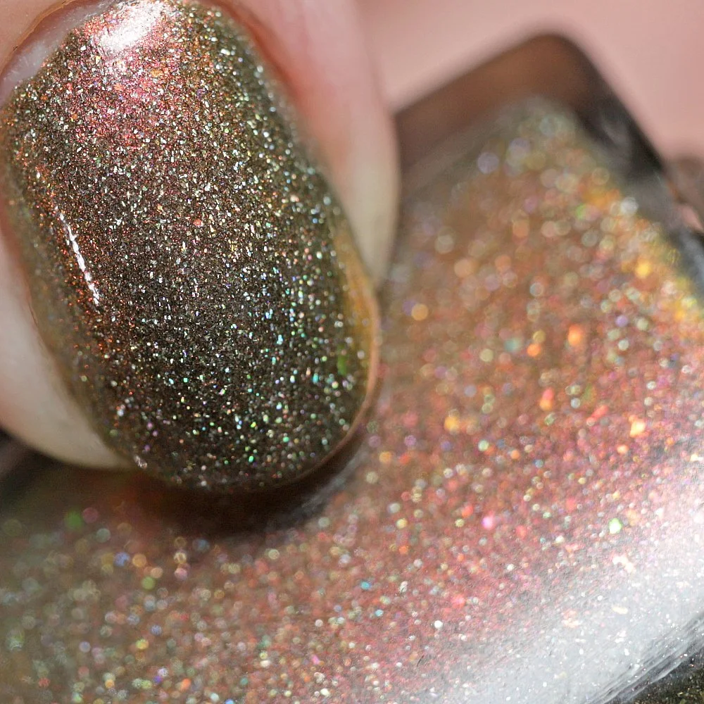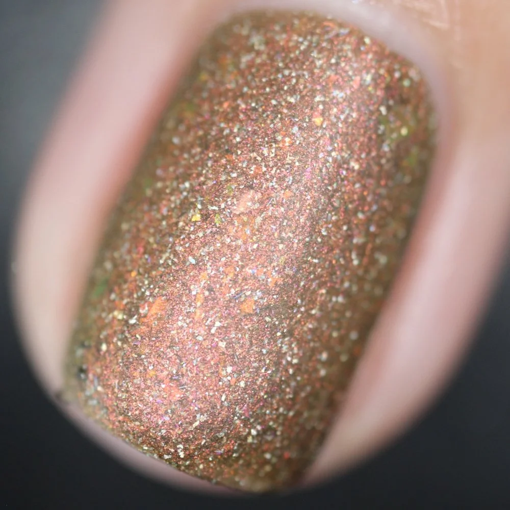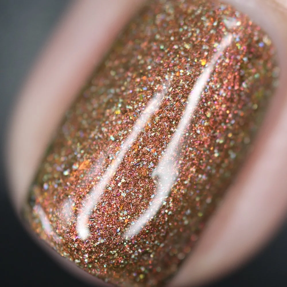 A dark orange base filled with orange-to-gold and red-to-green color shifting shimmer, orange-to-gold and red-to-yellow color shifting flakies, and holographic flakes. Fully opaque in 2-3 coats depending on application.