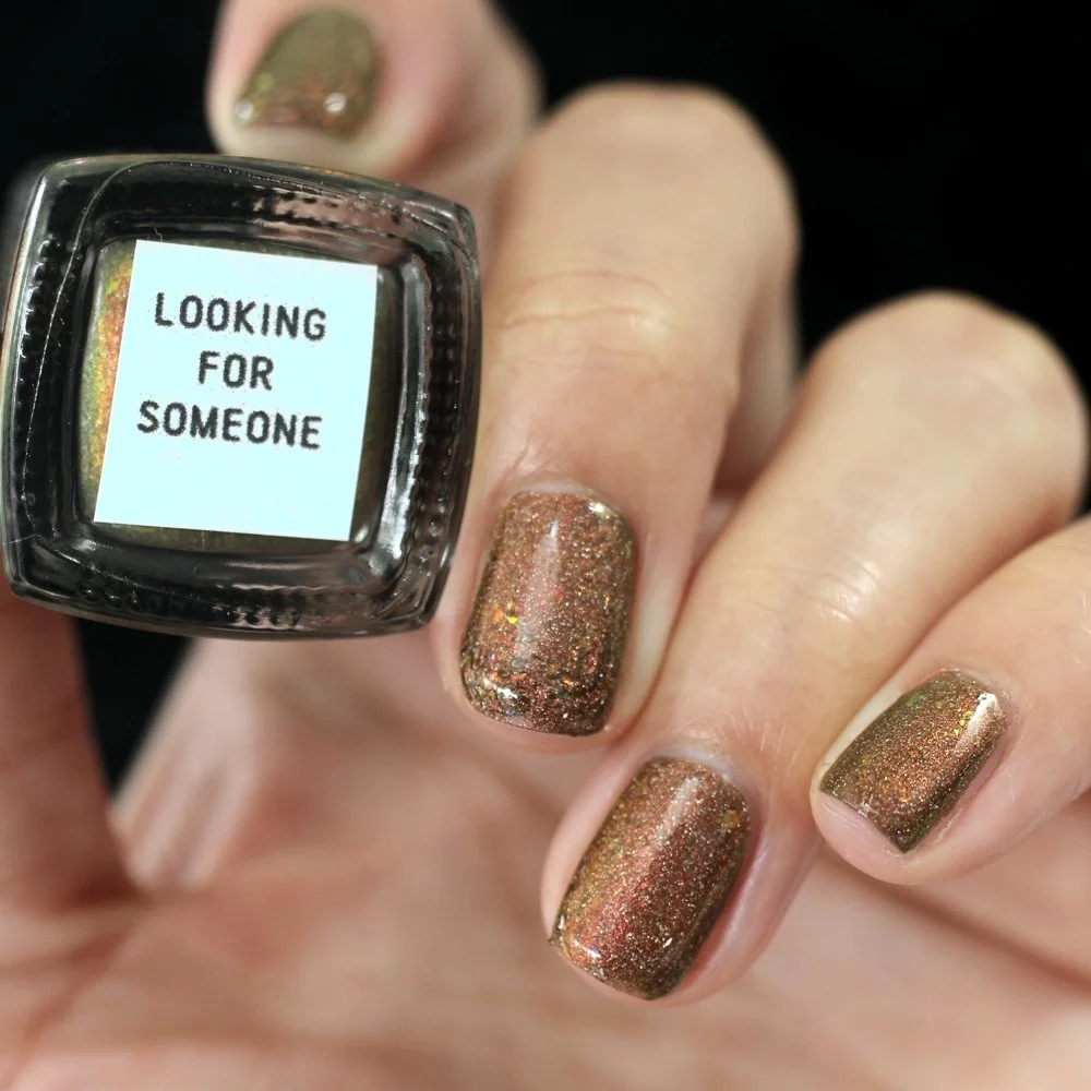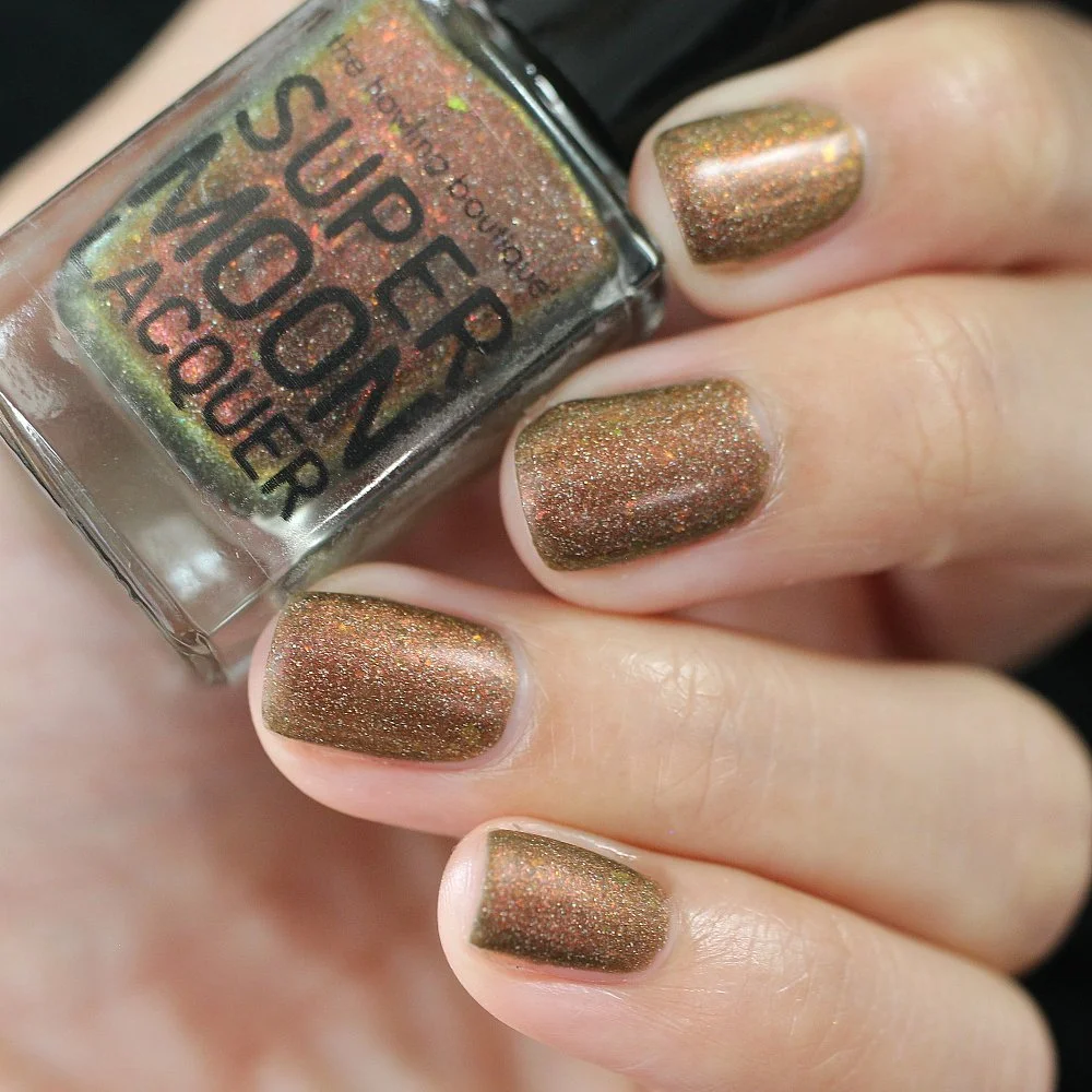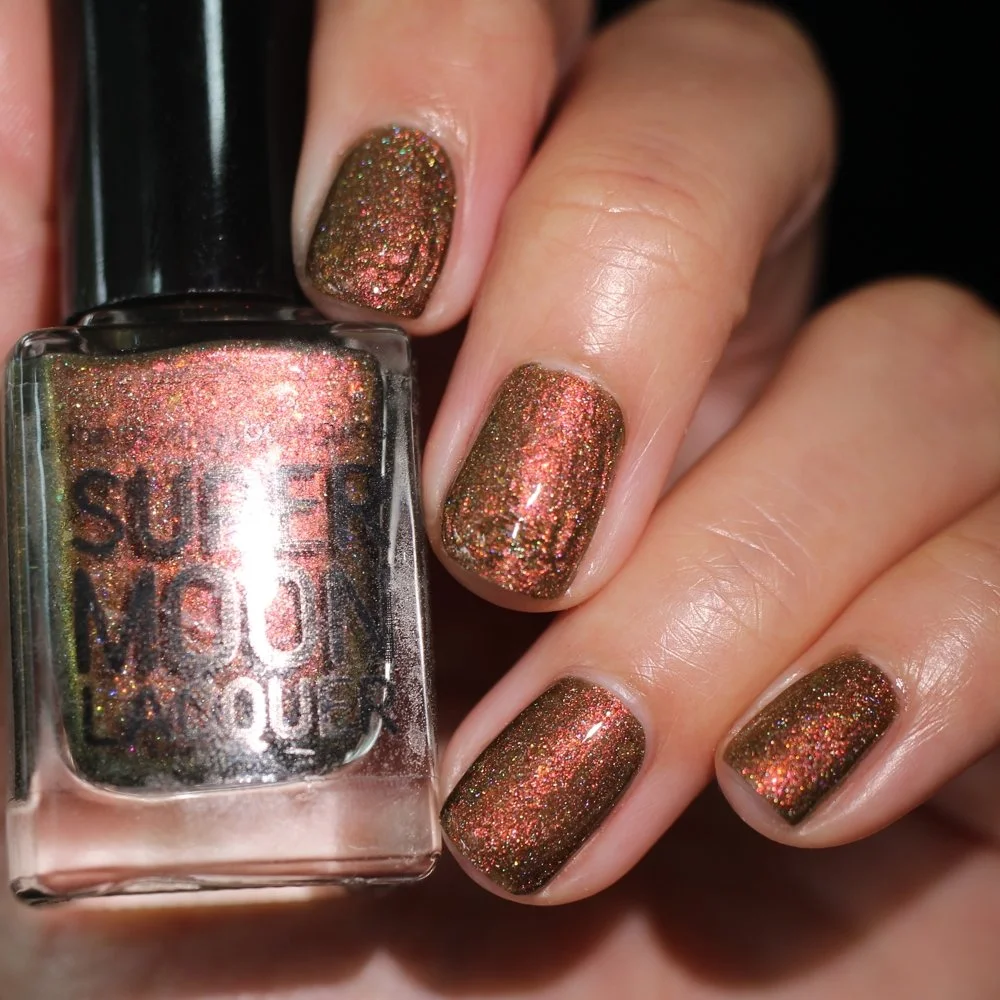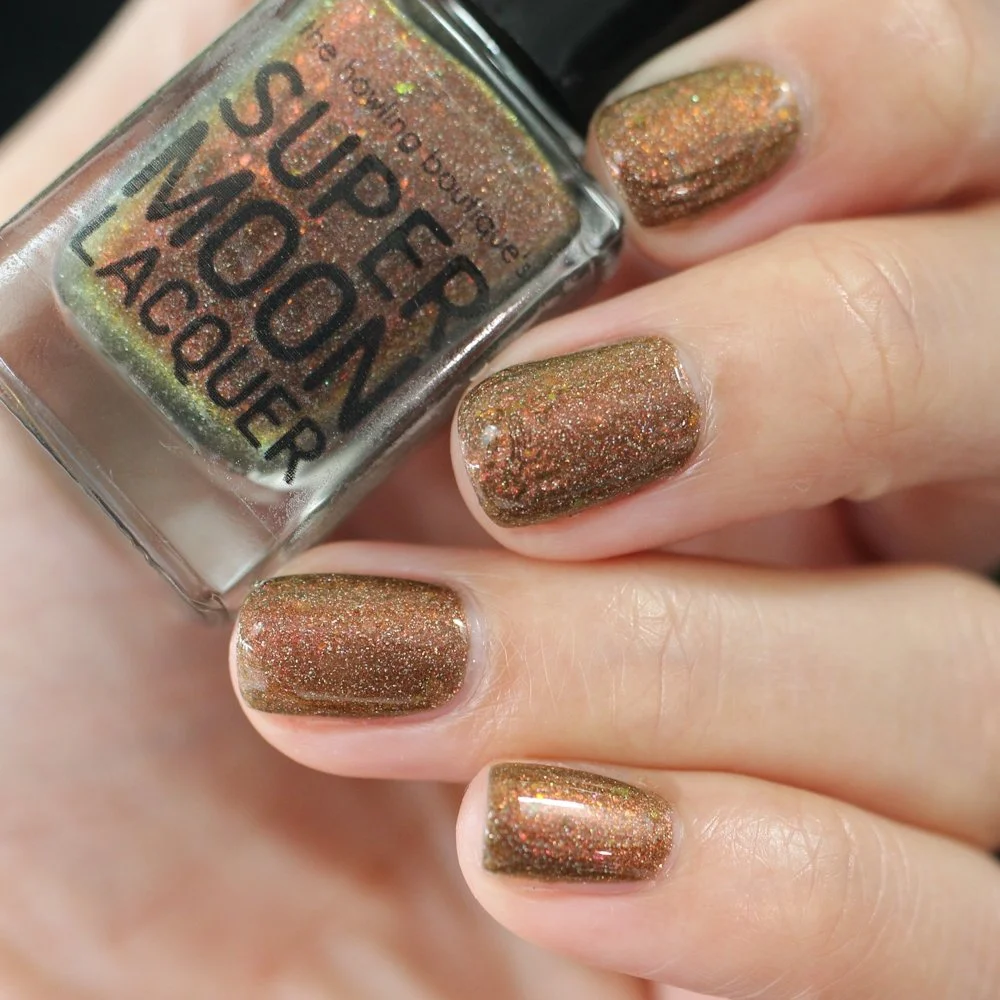 A dark orange base filled with orange-to-gold and red-to-green color shifting shimmer, orange-to-gold and red-to-yellow color shifting flakies, and holographic flakes. Fully opaque in 2-3 coats depending on application.