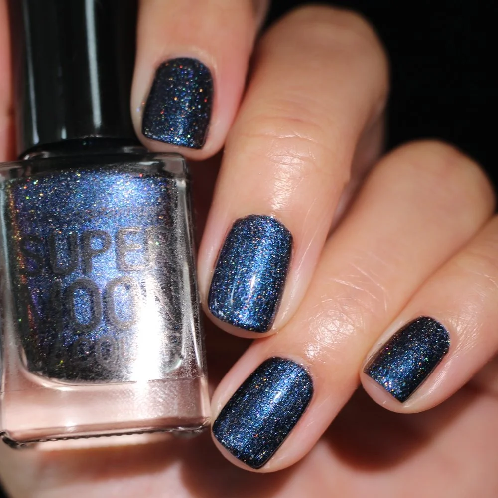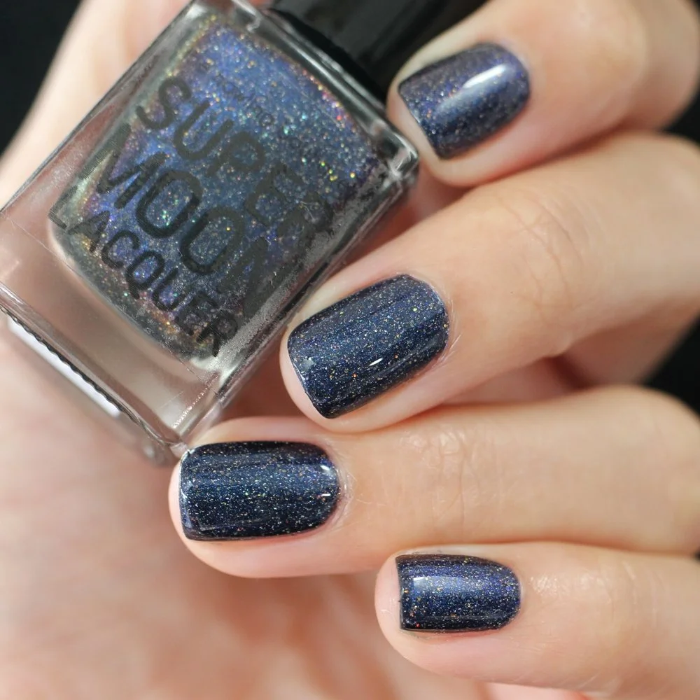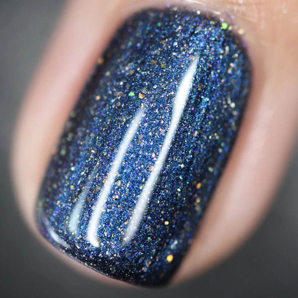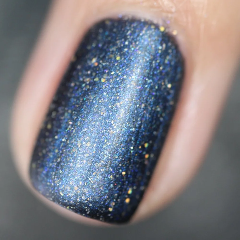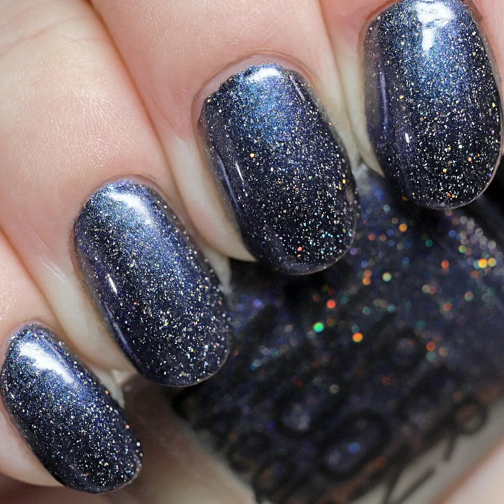 A black base filled with blue-to-red color shifting shimmer, gold shimmer, holographic gold glitter, and holographic flakes. Fully opaque in 2-3 coats depending on application.